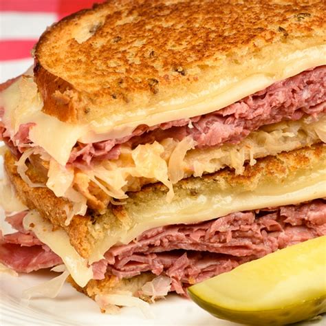 Bag sauerkraut drained · 1 lb. Grilled rye bread stuffed with corned beef, swiss cheese, sauerkraut and russian . Pile the corned beef on one side, then press sandwich together. As the bread begins to toast just slightly, and the cheese begins to soften, spread the heated . This classic deli sandwich is made by stuffing toasted rye bread with corned beef, sauerkraut, melted swiss cheese, and russian dressing. Choices of rye bread, dressing and cheese can bolster or mellow flavors in a reuben. 8 slices emmentaler or other swiss cheese, deli sliced. Evenly spread sauerkraut and place a slice of cheese over each slice of bread.